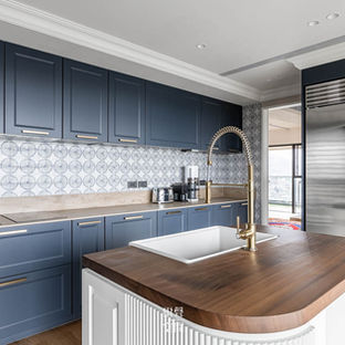 餐區天花延續弧形語彙,搭配Neverending Glory品牌的歌劇院口吹燈與隱藏軌道燈,提升光線層次與藝文氛圍,也精巧處理梁體與天花高差。廚房為獨立機能場域,視覺主軸落在花磚背牆與美式中島。中島採實木檯面結合法式陶瓷水槽與可拉伸龍頭,雙側配置側拉籃與大抽屜,呼應屋主旅居國外時的生活習慣,展現耐用、便利且開放的美式廚房氣息。